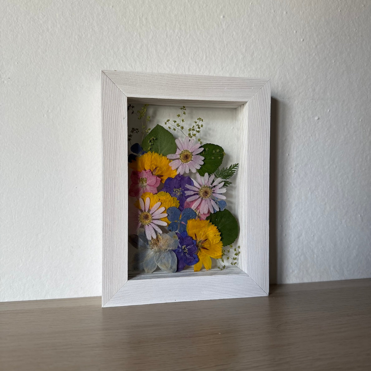 Květinový ručně vyrobený obraz s květy růžových, modrých a žlutých barviček, které rostou z rohu obrazu. Mezi květy najdete kopretiny, chryzantémy, ostrožky a mnoho dalšího.