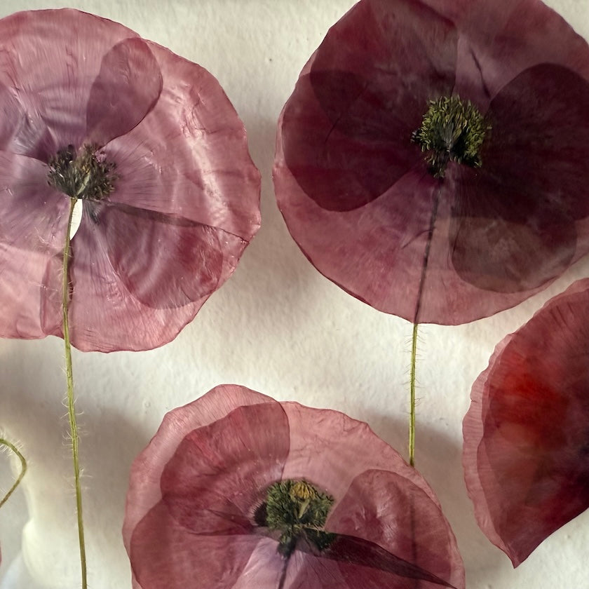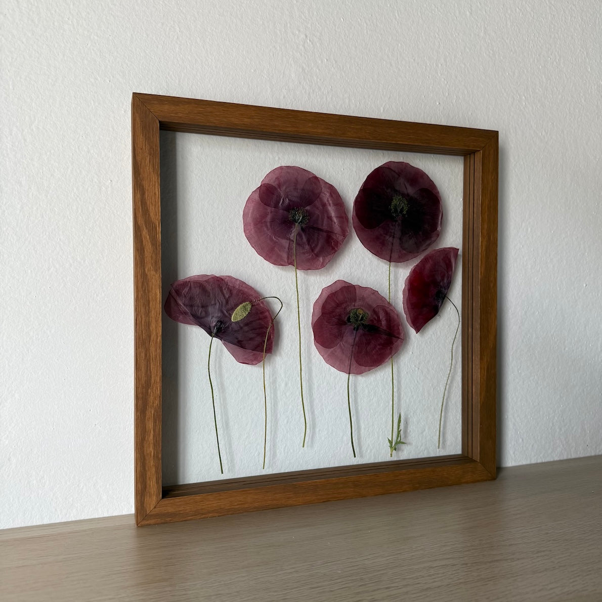 Květinový ručně vyrobený obraz s květy máků, které rostou ze středu obrazu.