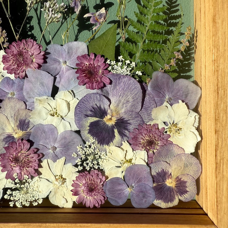 Květinové ručně vyrobený obrazy s květy ve fialových a bílých barvách. Mezi květy najdete hortenzie, ostrožky, macešky a mnoho dalšího.
