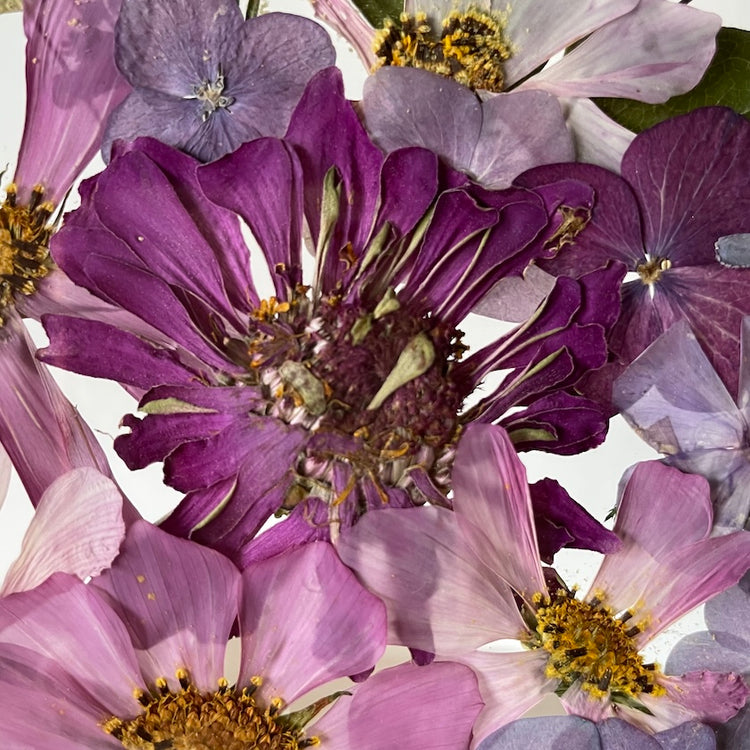 Květinový ručně vyrobený obraz s květy v růžových a fialových barvách, které rostou ze středu obrazu. Mezi květy najdete krásenky, hortenzie a mnoho dalšího.