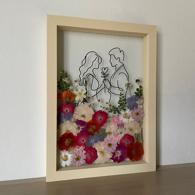 Květiny jsou zasazeny mezi skla a doplněny ručně vyráběným dřevěným rámem, který vzniká přímo v naší dílně. 🪵