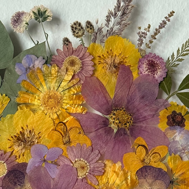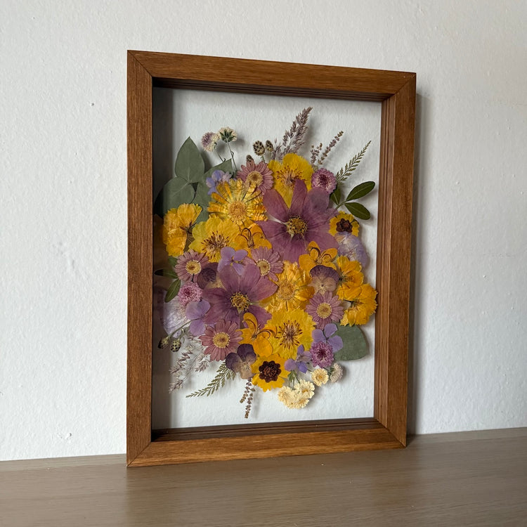 Použité květiny a rostliny jsou skutečné, ručně sbírané a šetrně lisované, aby si zachovaly svou přirozenou strukturu, jemnost i barevnost. 🌿 Následně jsou s citem aranžovány do jedinečné kompozice – každý obraz je originál, žádné dva kusy nejsou stejné.