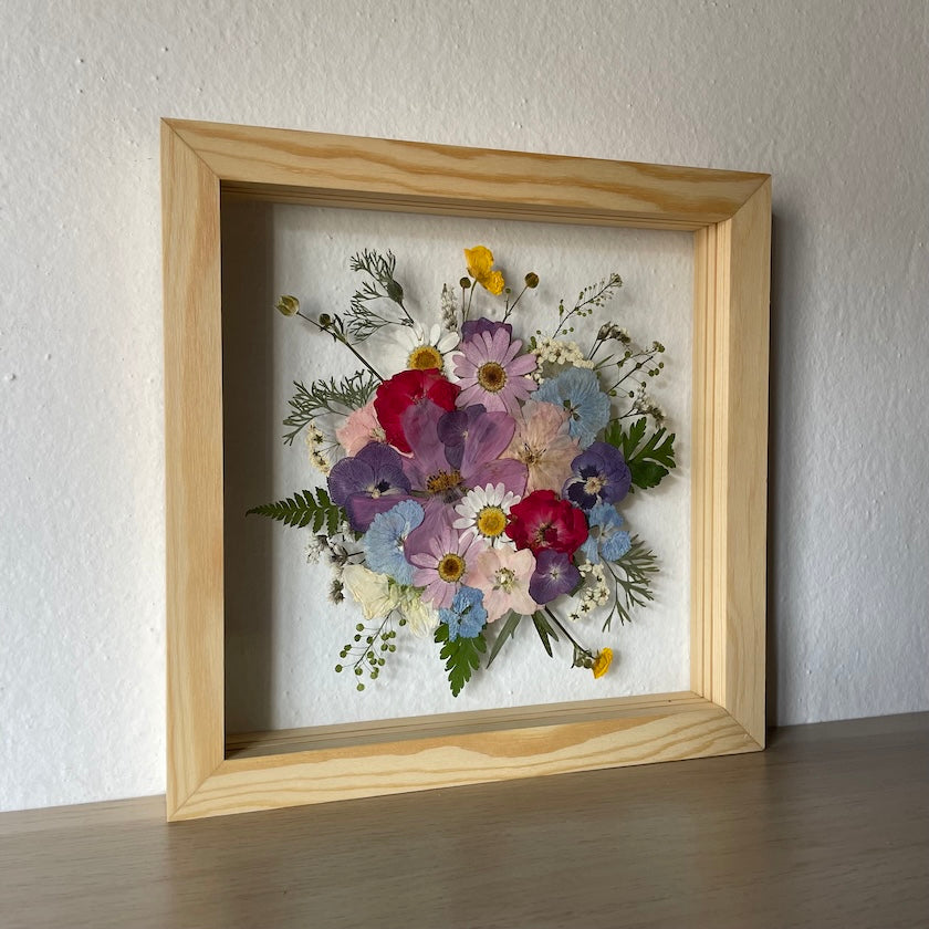 Květiny jsou zasazeny mezi skla a doplněny ručně vyráběným dřevěným rámem, který vzniká přímo v naší dílně. 🪵