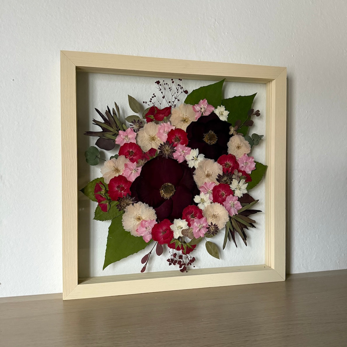 Květiny jsou zasazeny mezi skla a doplněny ručně vyráběným dřevěným rámem, který vzniká přímo v naší dílně. 🪵