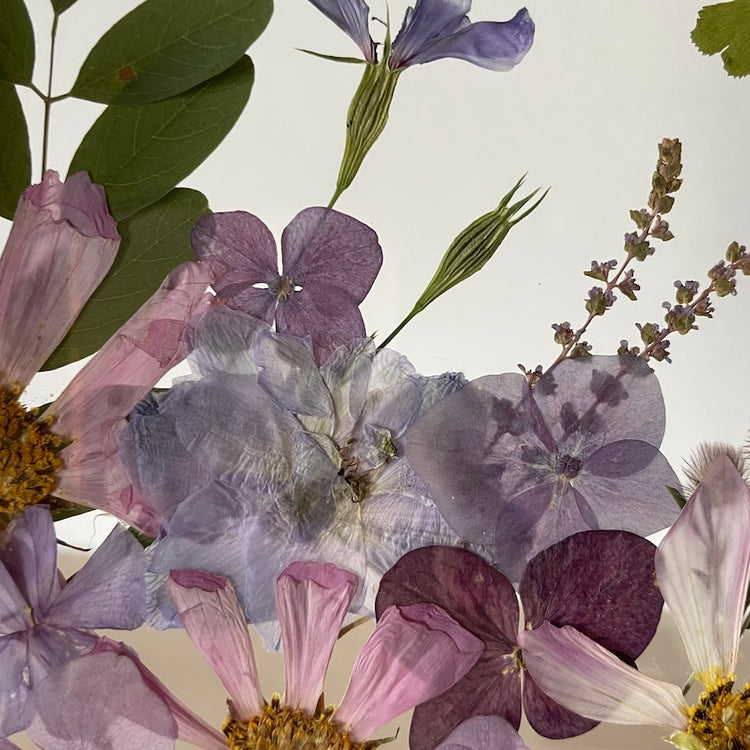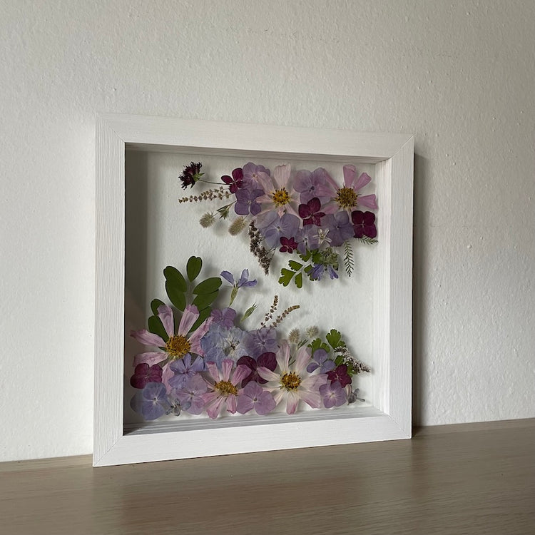Květinový ručně vyrobený obraz s květy v růžových a fialových barvách, které rostou z rohů obrazu. Mezi květy najdete krásenky, hortenzie a mnoho dalšího.