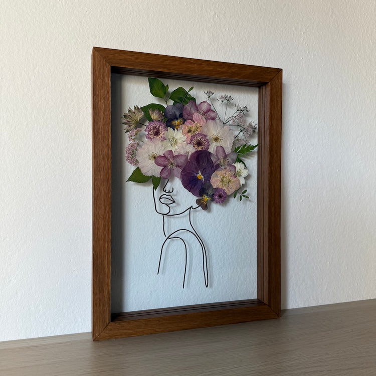 Květinový ručně vyrobený obraz s originální malovanou siluetou s květy v fialových, bílých a růžových barvách.