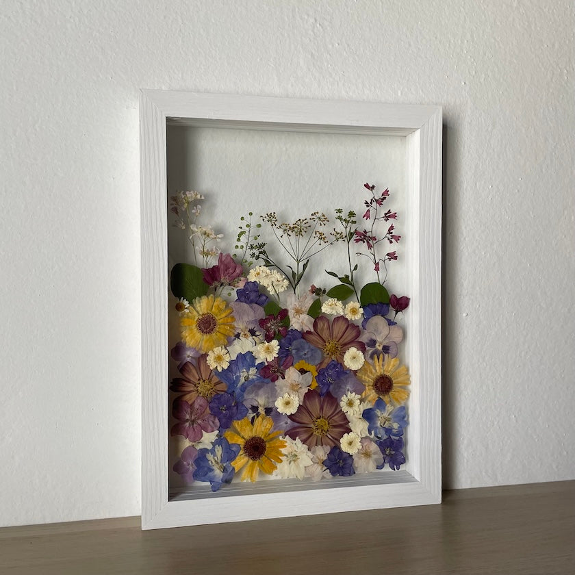 Květinový ručně vyrobený obraz s květy ve žlutých, fialových a modrých barvách, které rostou ze spodu obrazu. Mezi květy najdete krásenky, ostrožky, květy třešní a mnoho dalšího.