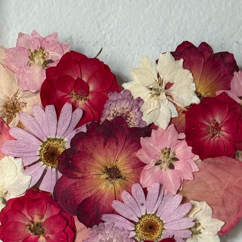 Květinový ručně vyrobený obraz s květy v červených, modrých a růžových barvách, které rostou do tvaru srdce. Mezi květy najdete růže, ostrožky, kopretiny a mnoho dalšího.