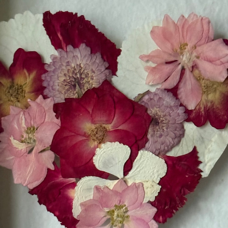 Květinový ručně vyrobený obraz s květy bílých, růžových a červených barviček, které rostou ve tvaru srdce ze středu obrazu. Mezi květy najdete květy třešní, růže, ostrožky a mnoho dalšího.
