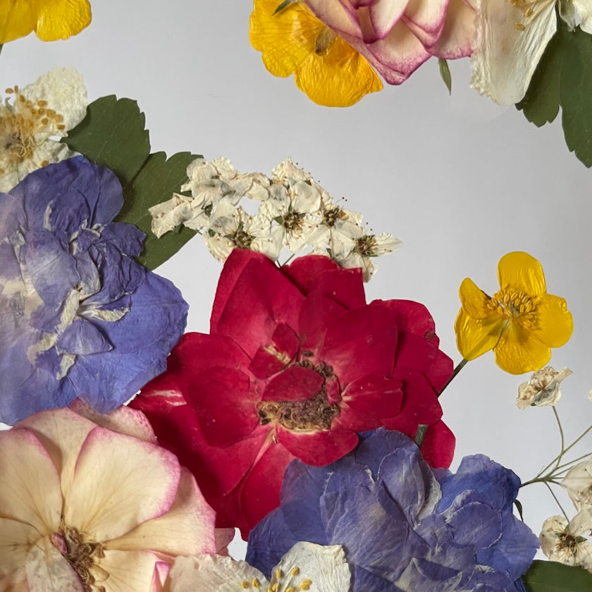 Květinový ručně vyrobený obraz s květy červených, žlutých a červených barev, které rostou z rohů obrazu. Mezi květy najdete pryskyřník, růže a další.