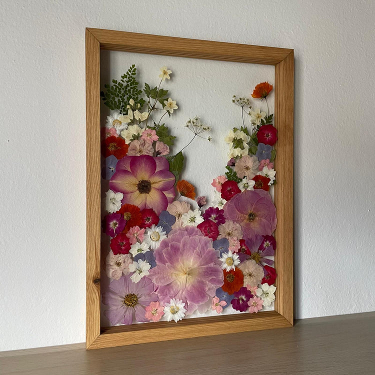 Květiny jsou zasazeny mezi skla a doplněny ručně vyráběným dřevěným rámem, který vzniká přímo v naší dílně. 🪵