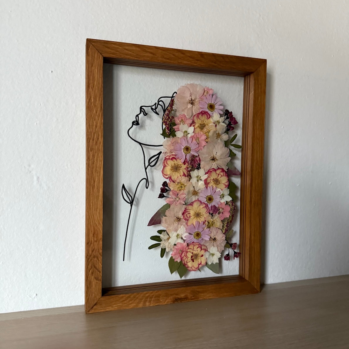 Květiny jsou zasazeny mezi skla a doplněny ručně vyráběným dřevěným rámem, který vzniká přímo v naší dílně. 🪵