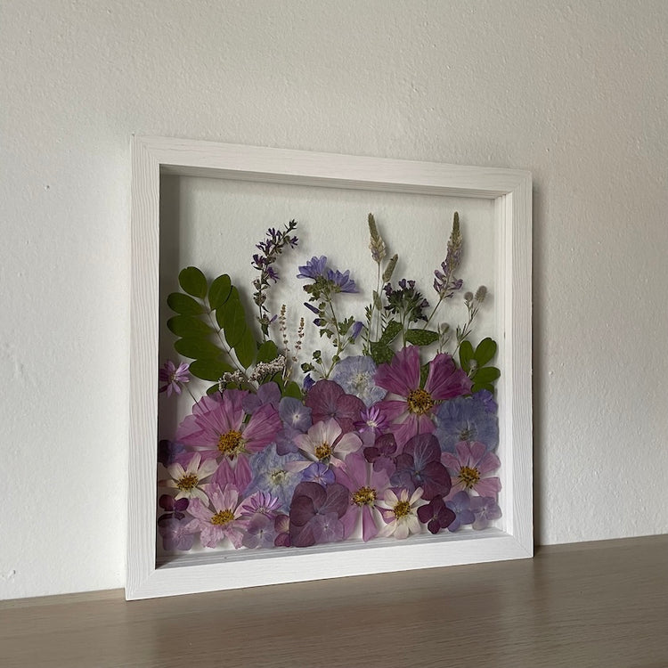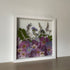 Květinový ručně vyrobený obraz s květy ve fialových a modrých barvách, které rostou ze spodu obrazu. Mezi květy najdete krásenky, hortenzie a mnoho dalšího.