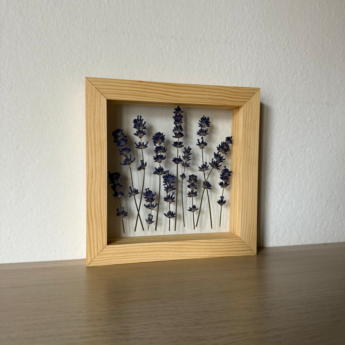 Květiny jsou zasazeny mezi skla a doplněny ručně vyráběným dřevěným rámem, který vzniká přímo v naší dílně. 🪵
