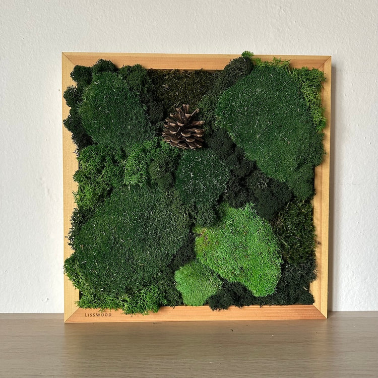 Ručně vyrobený obraz s nadýchanými chomáčky několika druhů mechu.