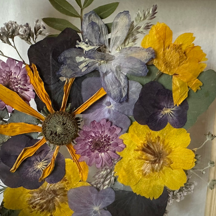Květinový ručně vyrobený obraz s květy žlutých, modrých a fialových barviček, které rostou ze středu obrazu. Mezi květy najdete chryzantému, hortenzie a mnoho dalšího.