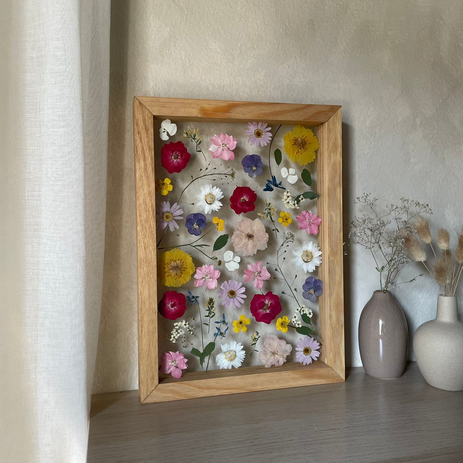 Květiny jsou zasazeny mezi skla a doplněny ručně vyráběným dřevěným rámem, který vzniká přímo v naší dílně. 🪵