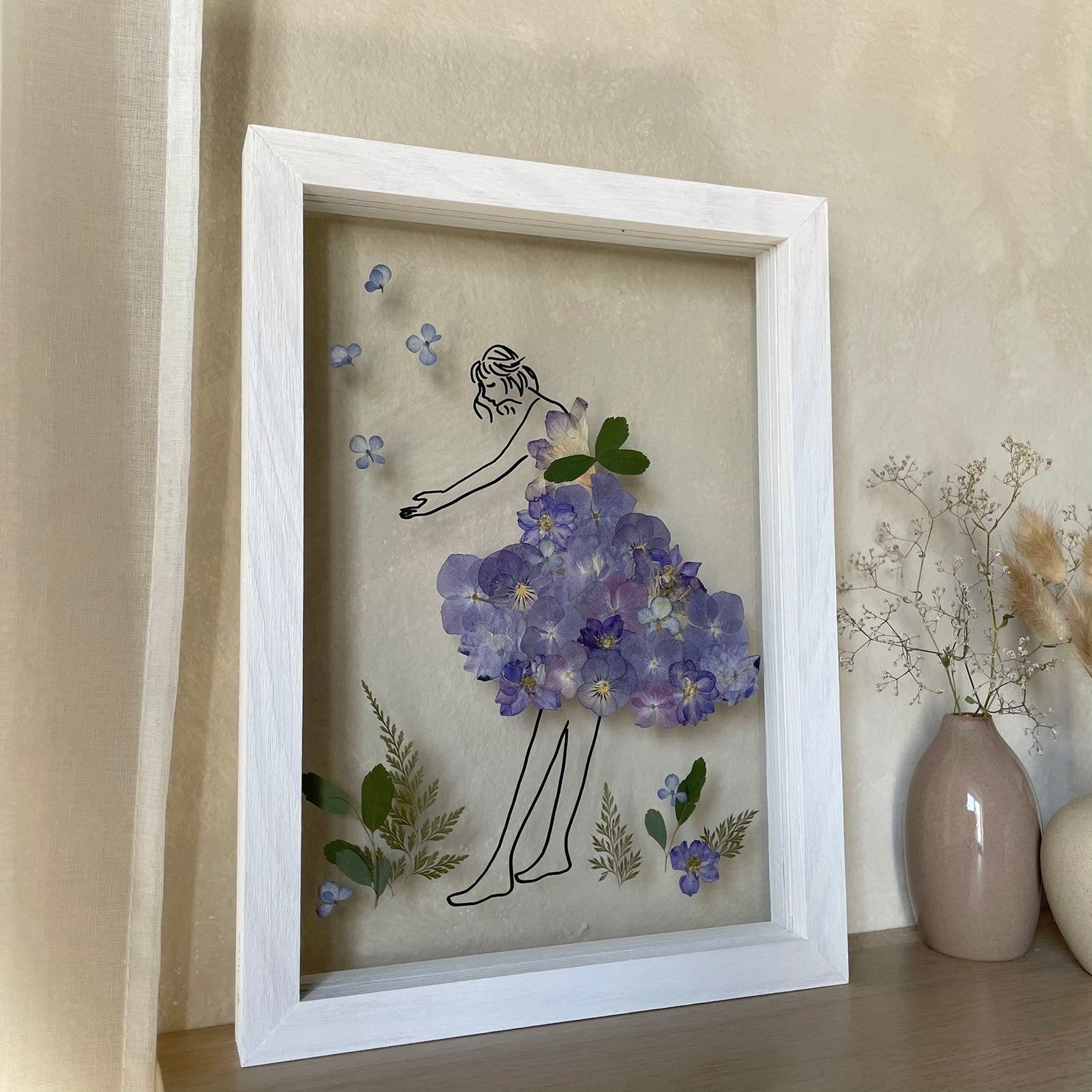 Použité květiny a rostliny jsou skutečné, ručně sbírané a šetrně lisované, aby si zachovaly svou přirozenou strukturu, jemnost i barevnost. 🌿 Následně jsou s citem aranžovány do jedinečné kompozice – každý obraz je originál, žádné dva kusy nejsou stejné.