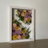 Květinový ručně vyrobený obraz s květy ve fialových a žlutých barvách, které rostou z rohů obrazu. Mezi květy najdete krásenky, růže a mnoho dalšího.