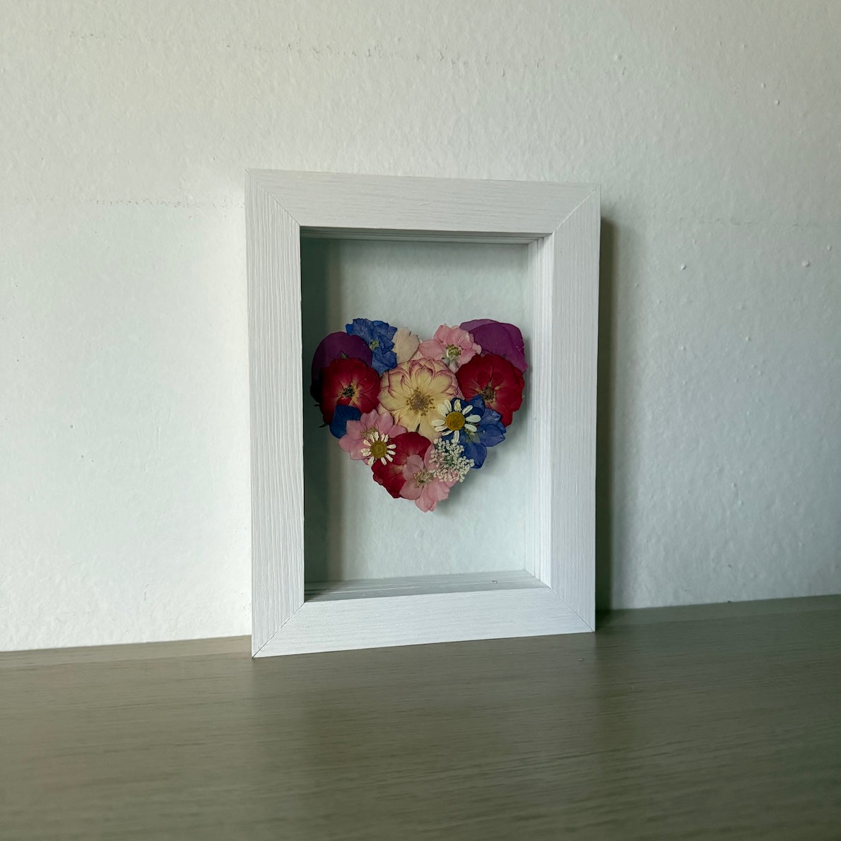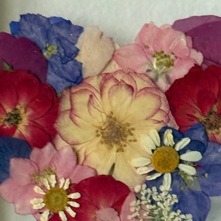Květinový ručně vyrobený obraz s květy modrých, růžových a červených barviček, které rostou ve tvaru srdce ze středu obrazu. Mezi květy najdete růže, ostrožky a mnoho dalšího.