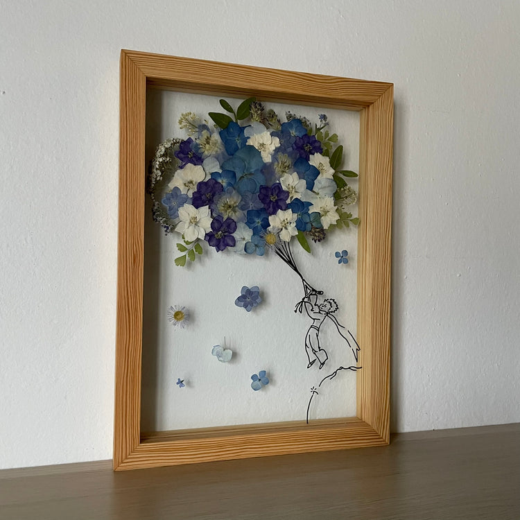 Květinový ručně vyrobený obraz s originální malovanou siluetou Malého prince s květy v modrých a bílých barvách.
