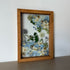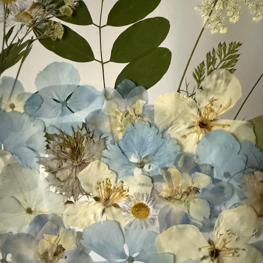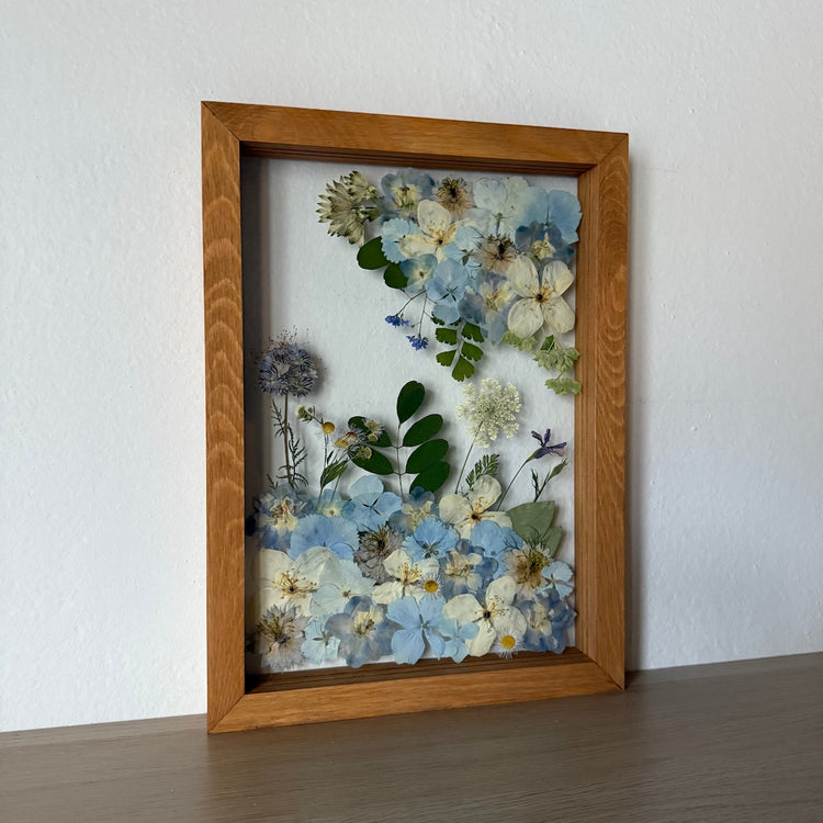 Květinový ručně vyrobený obraz s květy v modrých a bílých barvách, které rostou z rohů obrazu. Mezi květy najdete jasmín, černuchy, hortenzie a mnoho dalšího.