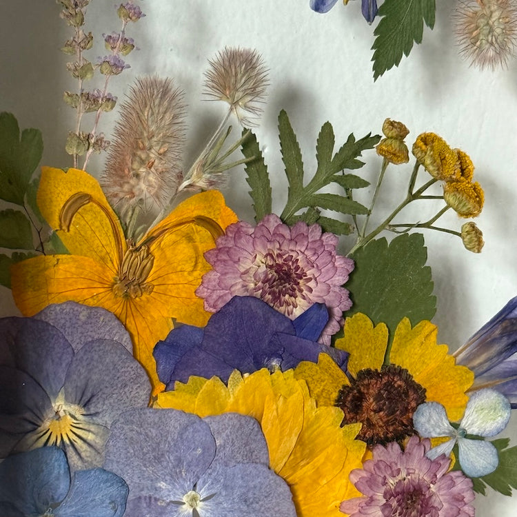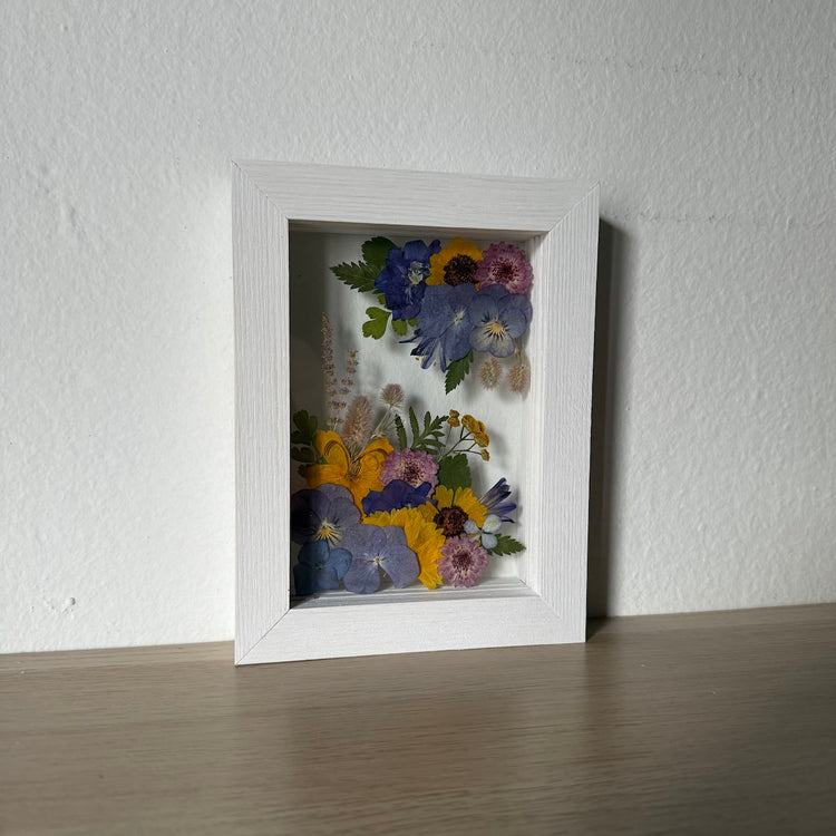 Použité květiny a rostliny jsou skutečné, ručně sbírané a šetrně lisované, aby si zachovaly svou přirozenou strukturu, jemnost i barevnost. 🌿 Následně jsou s citem aranžovány do jedinečné kompozice – každý obraz je originál, žádné dva kusy nejsou stejné.