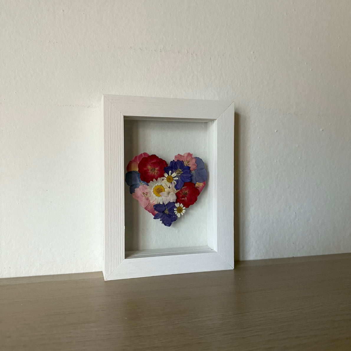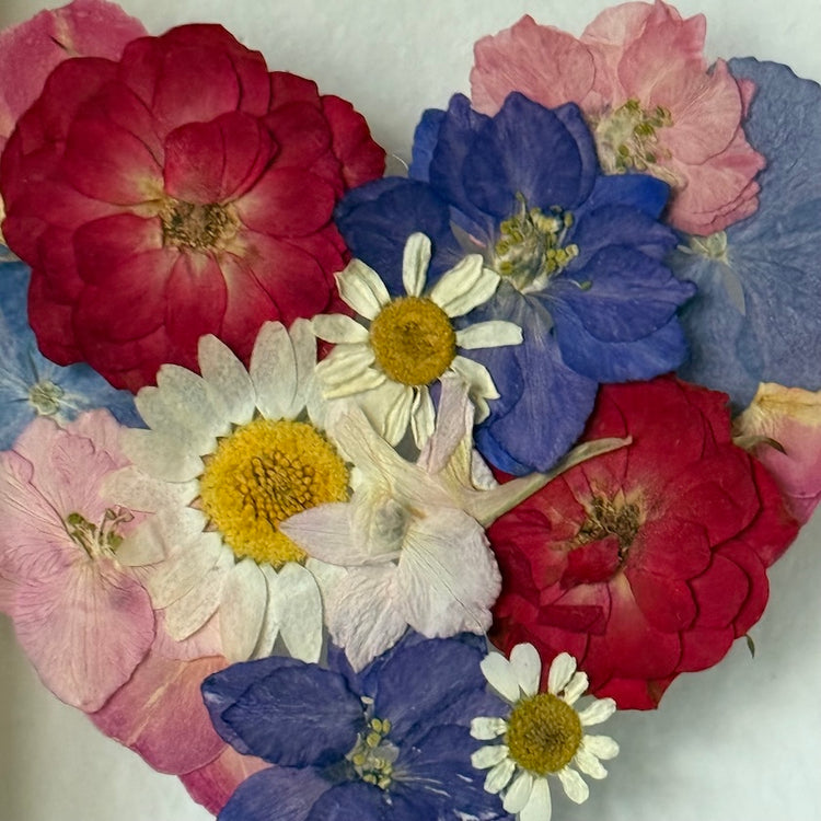 Květinový ručně vyrobený obraz s květy modrých, růžových a červených barviček, které rostou ve tvaru srdce ze středu obrazu. Mezi květy najdete růže, ostrožky a mnoho dalšího.
