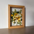 Květinový ručně vyrobený obraz s květy v bílých a žlutých barvách, které rostou ze středu obrazu. Mezi květy najdete květy měsíčku, ostrožky, pryskyřníků a mnoho dalšího.