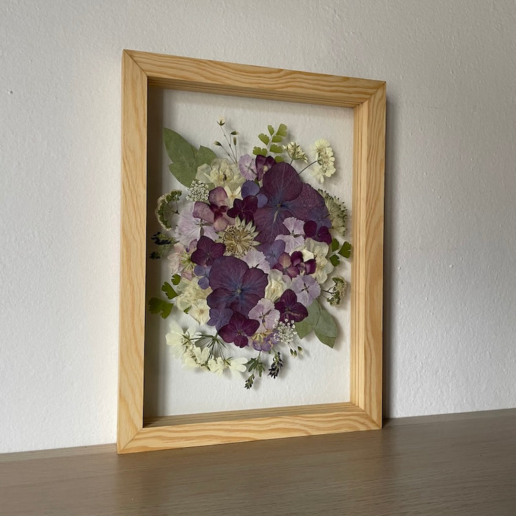Květinový ručně vyrobený obraz s květy v bílých, modrých a fialových barvách, které rostou ze středu obrazu. Mezi květy najdete hortenzie, paprsku a mnoho dalšího.