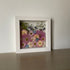 Květinový ručně vyrobený obraz s květy růžových, modrých a fialových barviček, které rostou z rohů obrazu. Mezi květy najdete krásenky, hortenzie a mnoho dalšího.