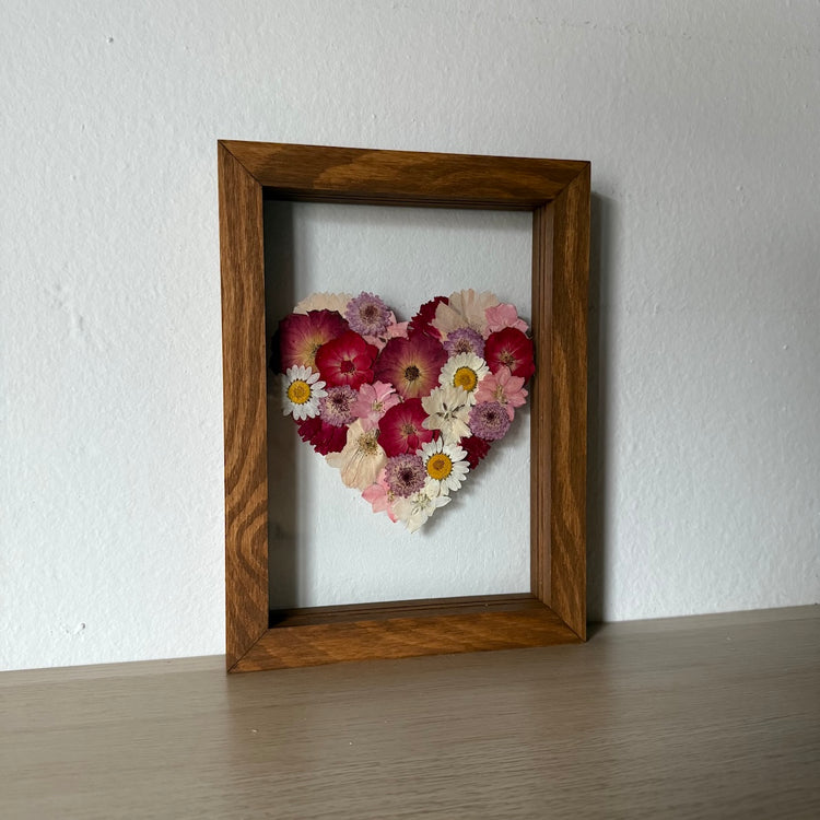 Květinový ručně vyrobený obraz s květy v červených a růžových barvách, které rostou do tvaru srdce. Mezi květy najdete růže, ostrožky, kopretiny a mnoho dalšího.
