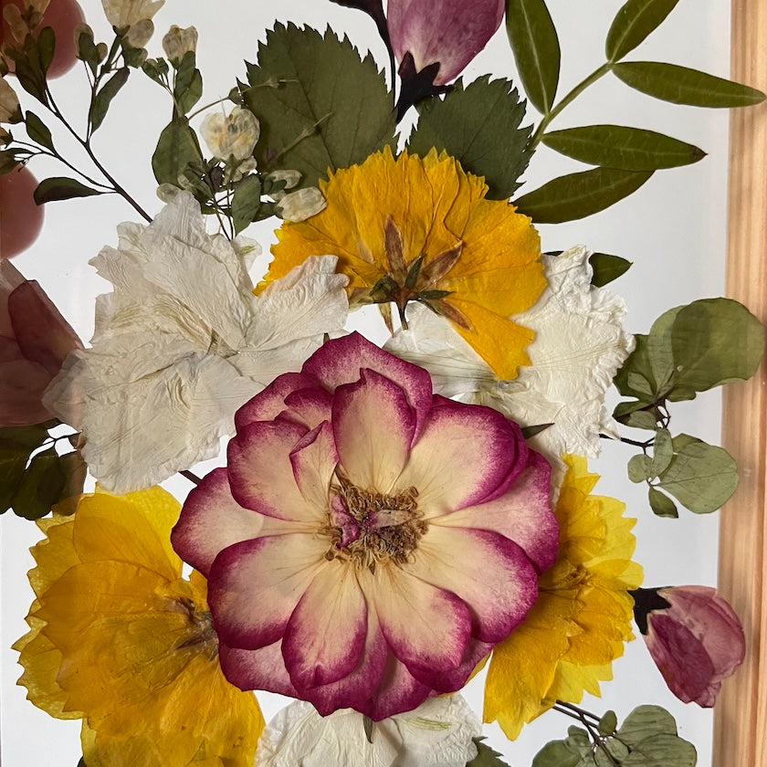 Květinový ručně vyrobený obraz s květy růžových, žlutých a bílých barev, které rostou ze středu obrazu. Mezi květy najdete ostrožky, růže a další.