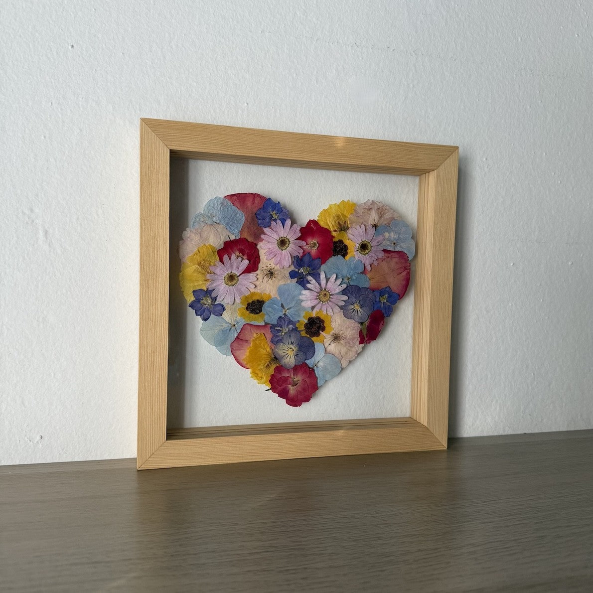 Květiny jsou zasazeny mezi skla a doplněny ručně vyráběným dřevěným rámem, který vzniká přímo v naší dílně. 🪵