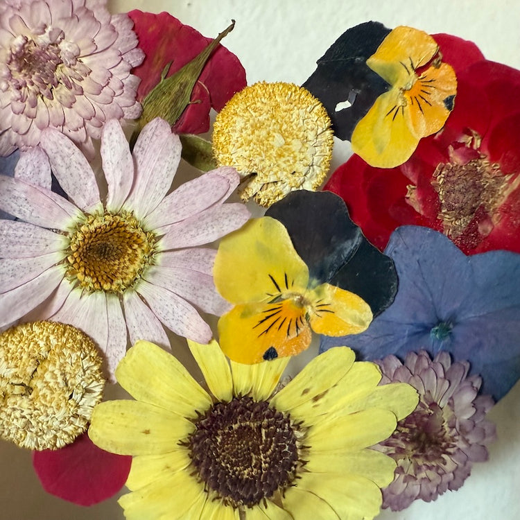 Květinový ručně vyrobený obraz s květy žlutých, červených a modrých barviček, které rostou ve tvaru srdce ze středu obrazu. Mezi květy najdete květy chryzantémy, hortenzie, růže a mnoho dalšího.