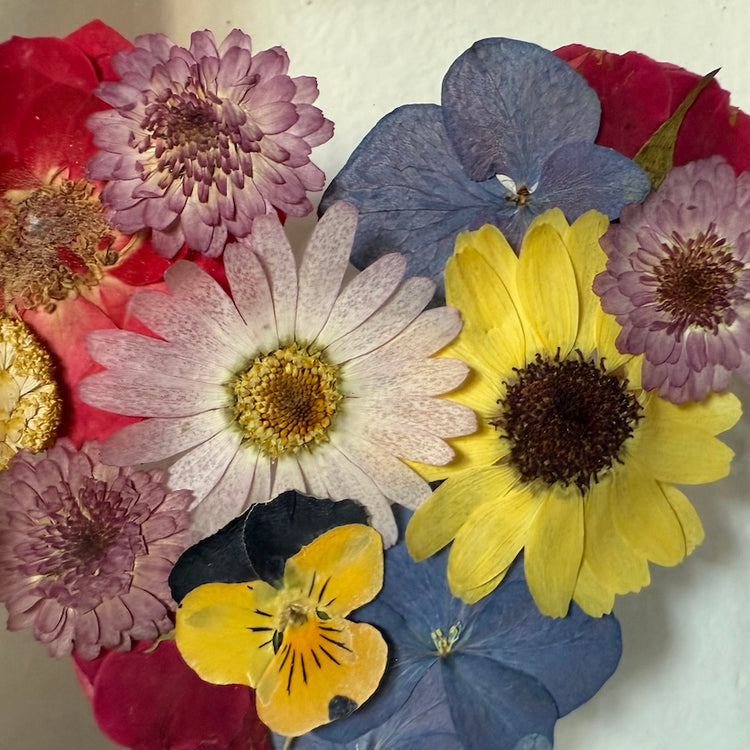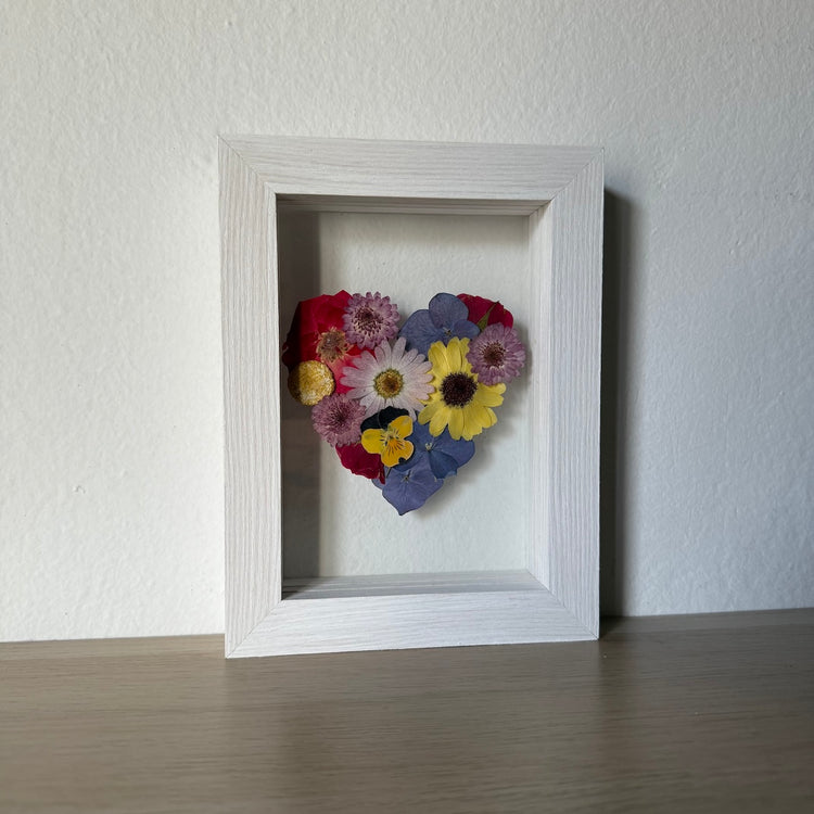 Květinový ručně vyrobený obraz s květy žlutých, červených a modrých barviček, které rostou ve tvaru srdce ze středu obrazu. Mezi květy najdete květy chryzantémy, hortenzie, růže a mnoho dalšího.