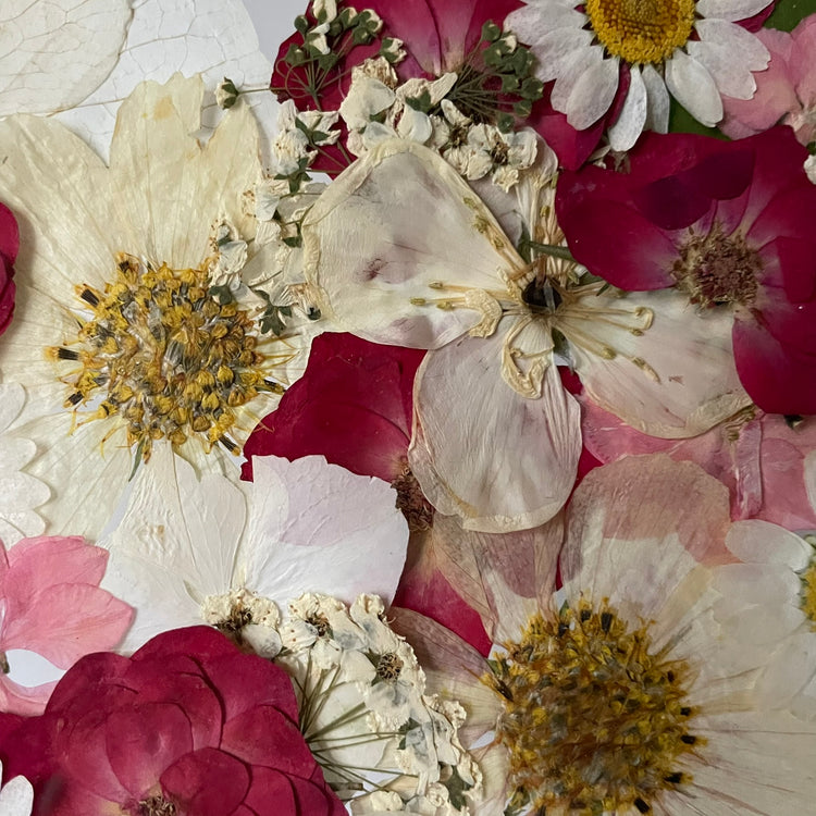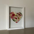 Květinový ručně vyrobený obraz s květy v červených, bílých a růžových barvách, které rostou ze středu obrazu ve tvaru srdce. Mezi květy najdete krásenky, květy třešní, růže a mnoho dalšího.