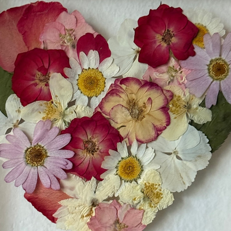 Květinový ručně vyrobený obraz s květy v růžových, bílých a červených barvách, které rostou ve tvaru srdce. Mezi květy najdete ostrožky, růže a mnoho dalšího.