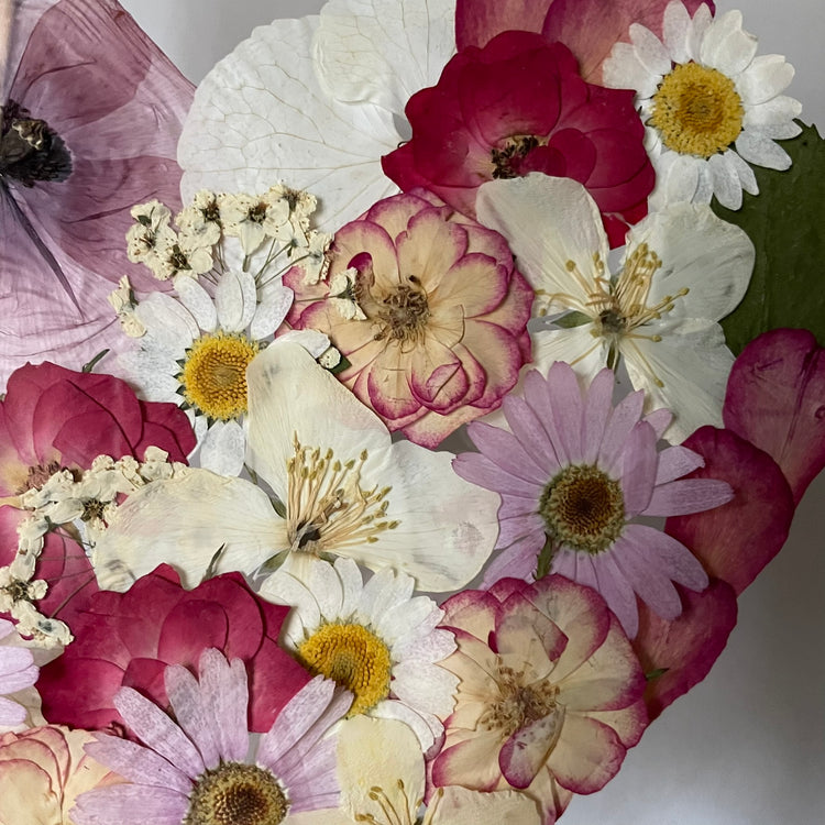 Květinový ručně vyrobený obraz s květy v červených, bílých a růžových barvách, které rostou ze středu obrazu ve tvaru srdce. Mezi květy najdete krásenky, květy třešní, růže a mnoho dalšího.