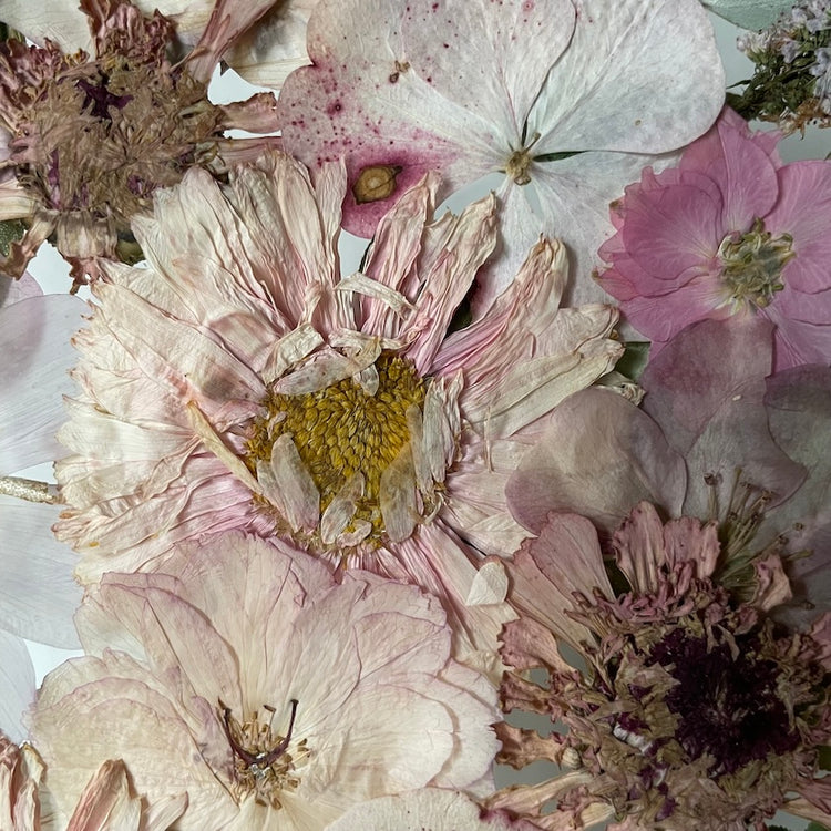 Květinový ručně vyrobený obraz s květy v růžových a bílých barvách, které rostou ze středu obrazu. Mezi květy najdete ostrožky, květy třešní a mnoho dalšího.
