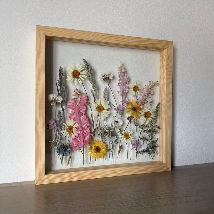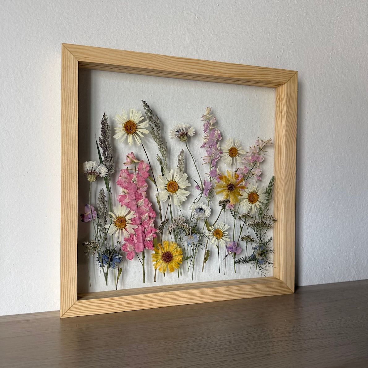 Květiny jsou zasazeny mezi skla a doplněny ručně vyráběným dřevěným rámem, který vzniká přímo v naší dílně. 🪵