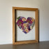 Květinový ručně vyrobený obraz s květy ve fialových, modrých a růžových barvách, které rostou ze středu obrazu ve tvaru srdce. Mezi květy najdete ostrožky, květy třešní, růže a mnoho dalšího.