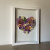 Květinový ručně vyrobený obraz s květy ve fialových, modrých a bílých barvách, které rostou ze středu obrazu ve tvaru srdce. Mezi květy najdete chryzantémy, krásenky, růže a mnoho dalšího.