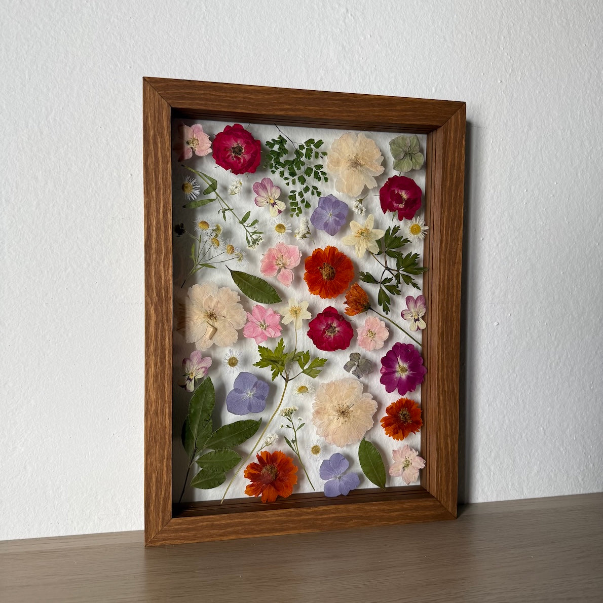 Květiny jsou zasazeny mezi skla a doplněny ručně vyráběným dřevěným rámem, který vzniká přímo v naší dílně. 🪵