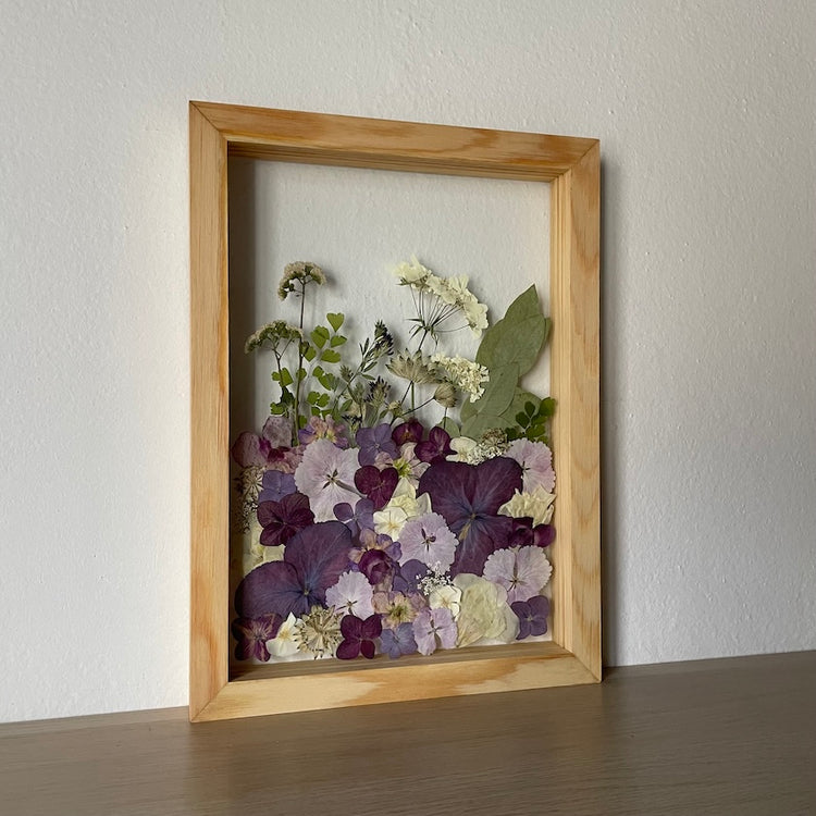 Květinový ručně vyrobený obraz s květy v bílých a fialových barvách, které rostou ze spodu obrazu. Mezi květy najdete hortenzie, paprsku a mnoho dalšího.