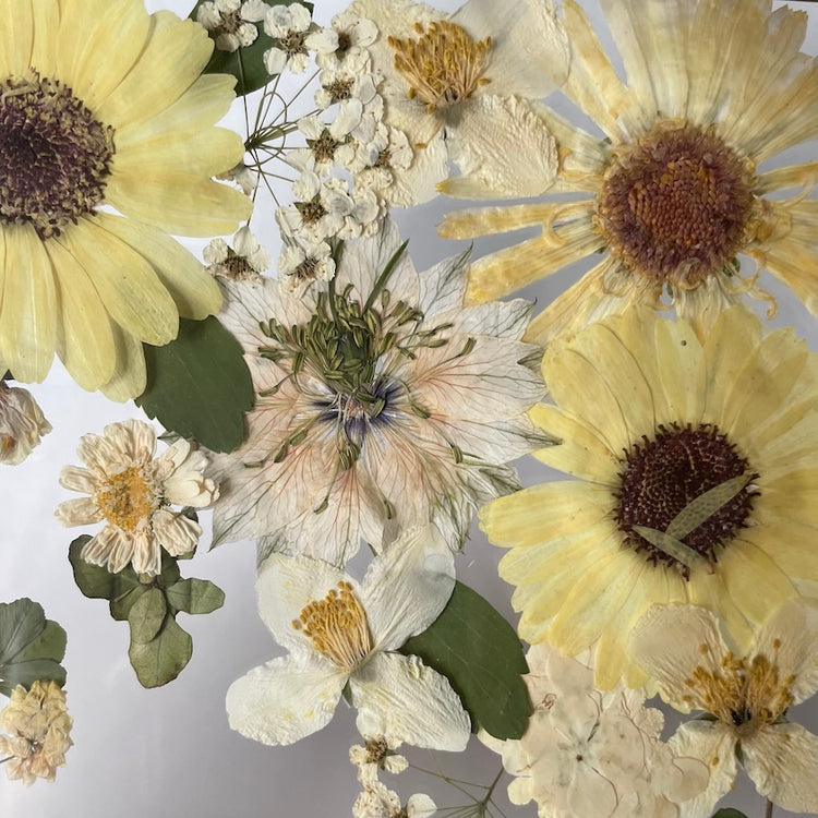Květinový ručně vyrobený obraz s květy ve žlutých a bílých barvách, které rostou z rohů obrazu. Mezi květy najdete měsíčky, jasmín a mnoho dalšího.