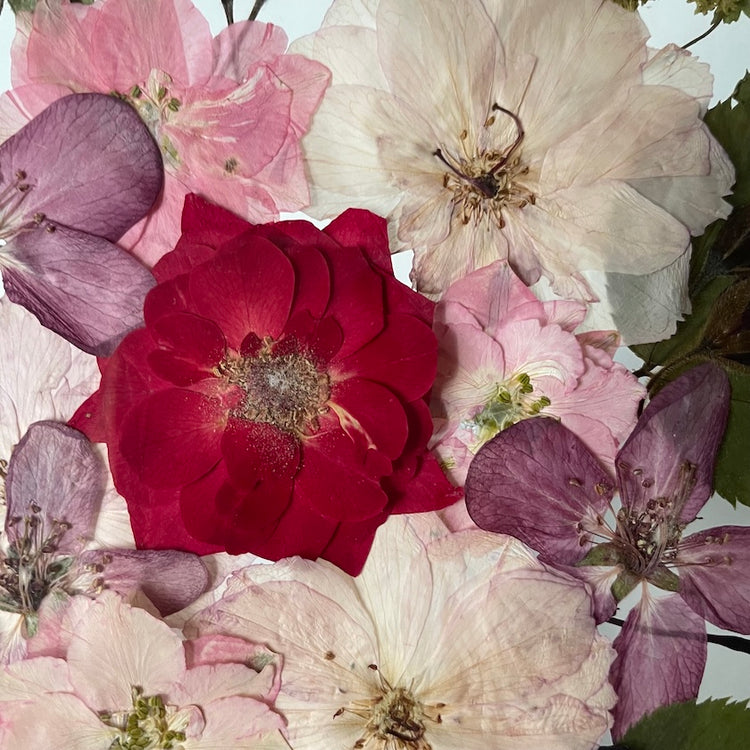 Květinový ručně vyrobený obraz s květy růžových a červených barviček, které rostou ze středu obrazu. Mezi květy najdete růže, ostrožky, květy třešní a mnoho dalšího.