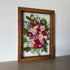 Květinový ručně vyrobený obraz s květy v červených, oranžových a růžových barvách, které rostou ze středu obrazu. Mezi květy najdete růže, ostrožky, třešně a mnoho dalšího.