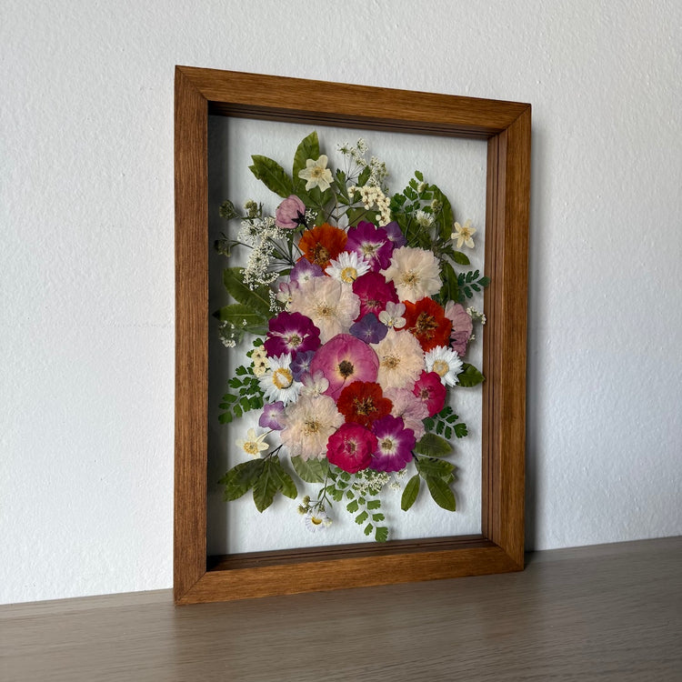 Květiny jsou zasazeny mezi skla a doplněny ručně vyráběným dřevěným rámem, který vzniká přímo v naší dílně. 🪵