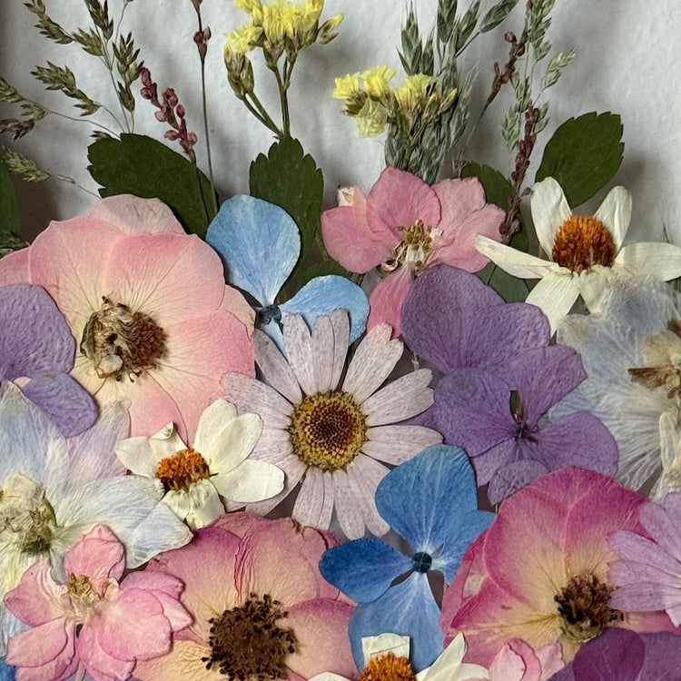 Použité květiny a rostliny jsou skutečné, ručně sbírané a šetrně lisované, aby si zachovaly svou přirozenou strukturu, jemnost i barevnost. 🌿 Následně jsou s citem aranžovány do jedinečné kompozice – každý obraz je originál, žádné dva kusy nejsou stejné.